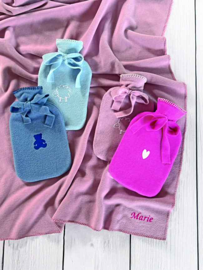 Von Herz über Schneeflocke bis zu Teddy und Schaf – die niedlichen Flockdruck-Motive und der farbige Kämmstich verleihen jeder Wärmflasche einen individuellen Charakter. Die kleine Schleife am Flaschenhals rundet das Design ab.